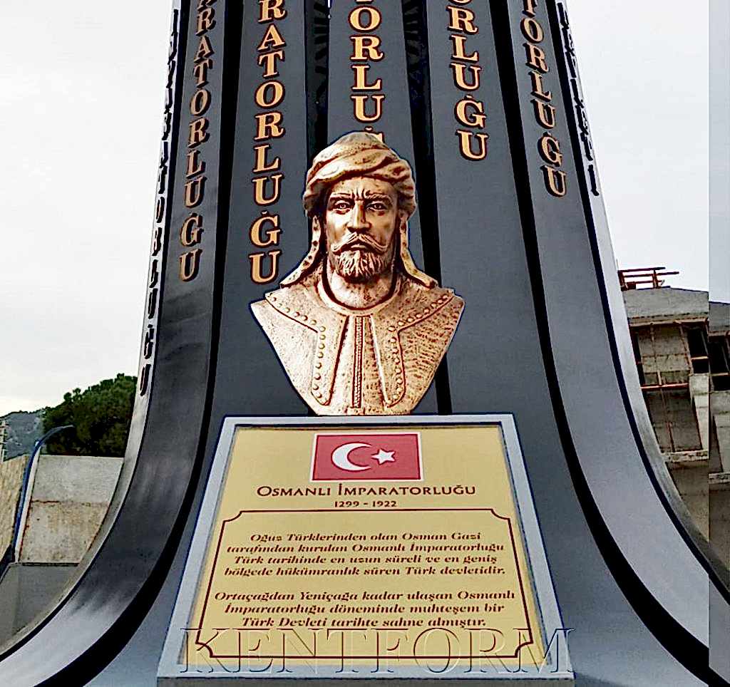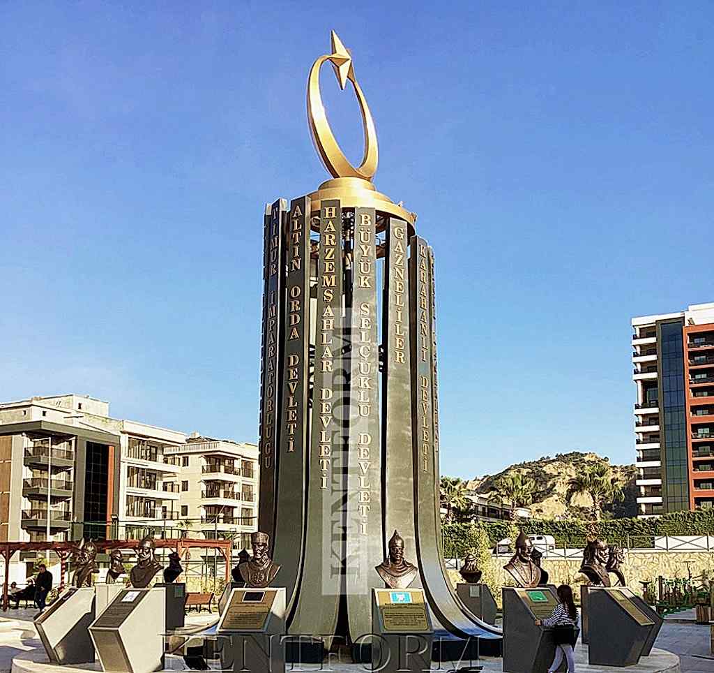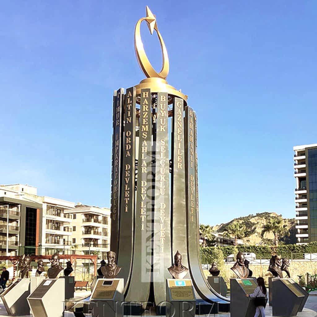 16 Türk devletini simgeleyen sütunların önünde kitabe yapısında kaide bulunmaktadır. Bu kaideler üzerinde 16 Türk devletinin sancakları ve devletin başlangıç- bitiş tarihi yer alır. Şehitlik, merkezi alanlar ve tarihi yerler için daha uygun olan bu Kentform Anıtsal Heykeller imzalı tasarımda detaylar göz kamaştırıcıdır.