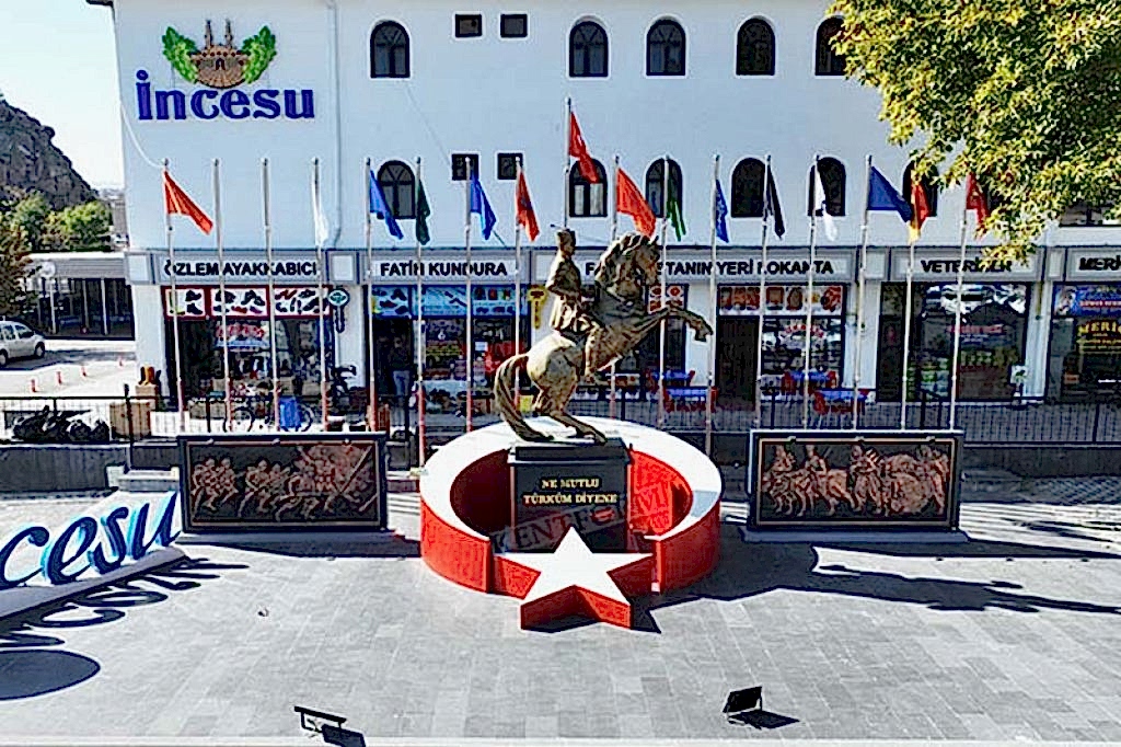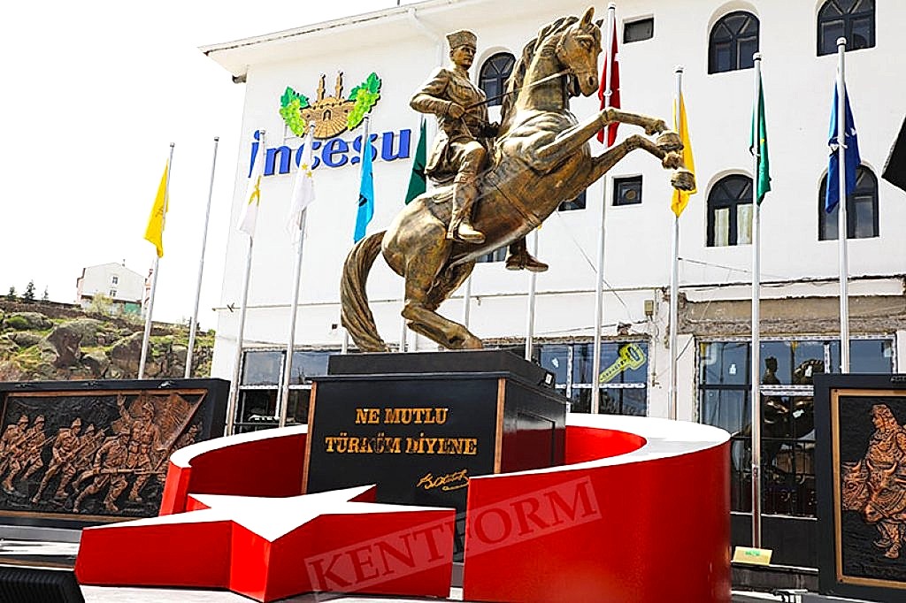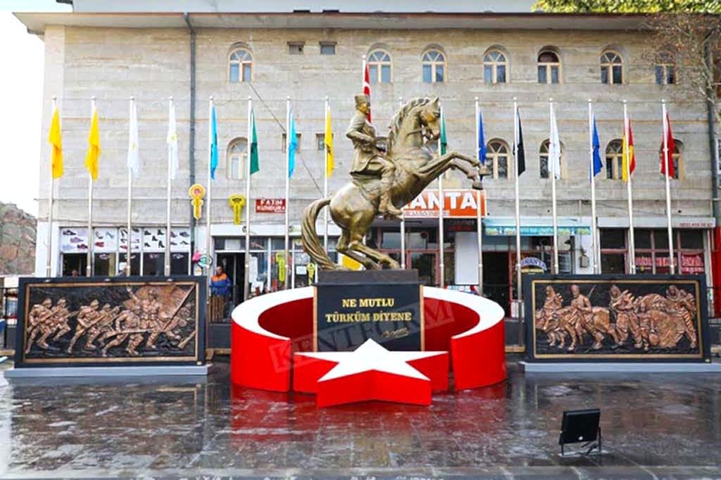 Kentform’un bu projesinde dört adet hilal içerisinden ‘Ne Mutlu Türküm Diyene’ ve Mustafa Kemal Atatürk’ün imzalı kaidesi yer alır. Bu destekleyici öge olan kaide üzerinde ise şahlanmış at üzerinde Atatürk anıtı yer alır. Şehir meydanlarında ve tören alanlarında yer alan bu anıtın detayları için Kentform Anıtsal Heykeller internet sitesini ziyaret edin.