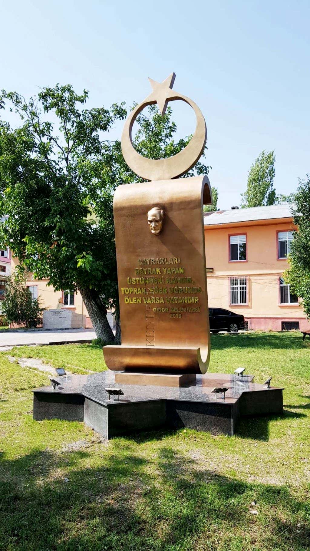 850 cm yüksekliğindeki bayrak anıtında kaidenin üst kısmından yukarıya doğru genişleyen Ay- Yıldız figürü bulunmaktadır. Ay- Yıldız figürü ise bir el tarafından kavranmış şekilde tasvir edilmektedir. Anıttaki kaidenin dört yüzeyinde Türk bayrağı bulunmaktadır.