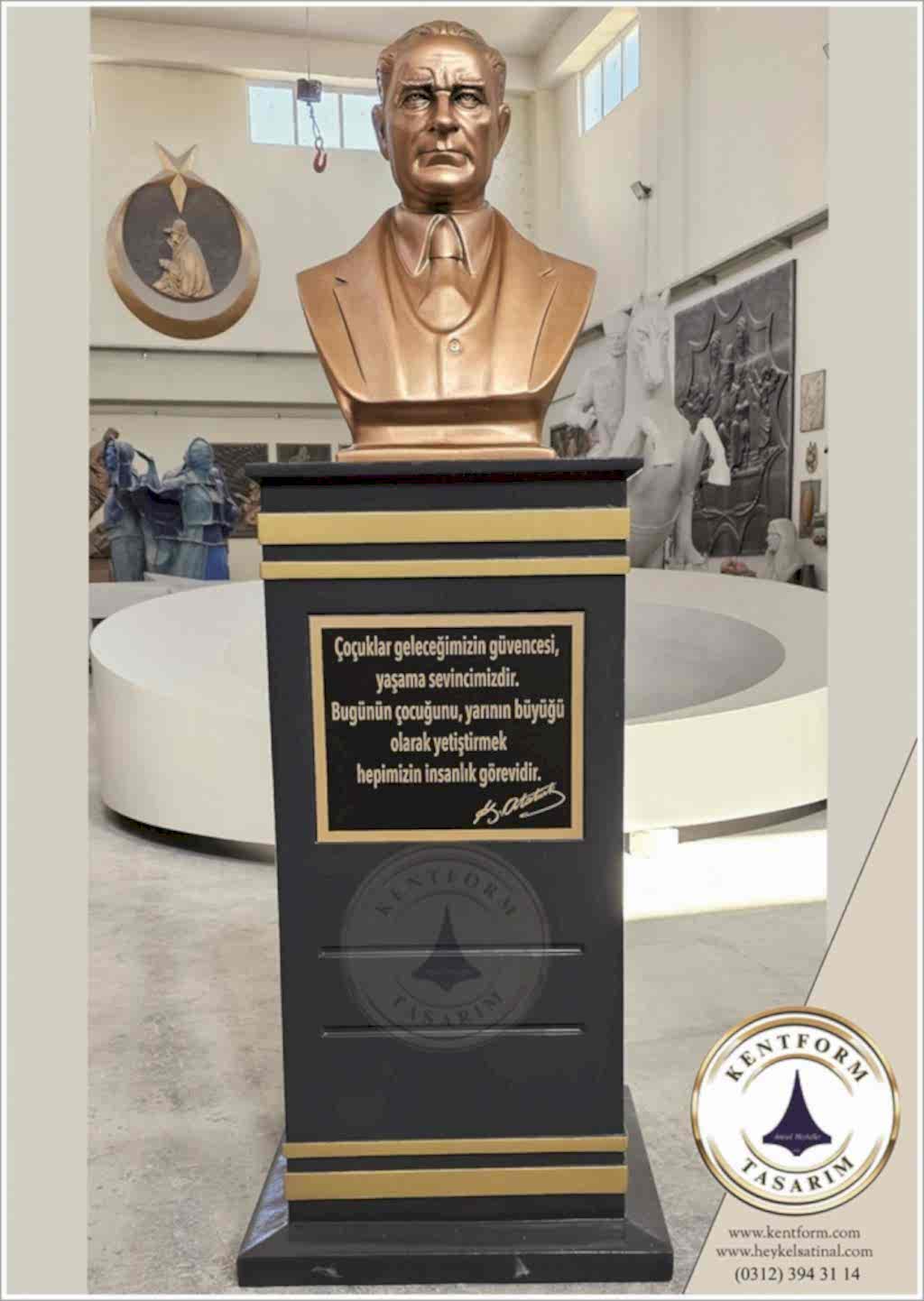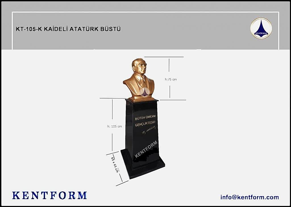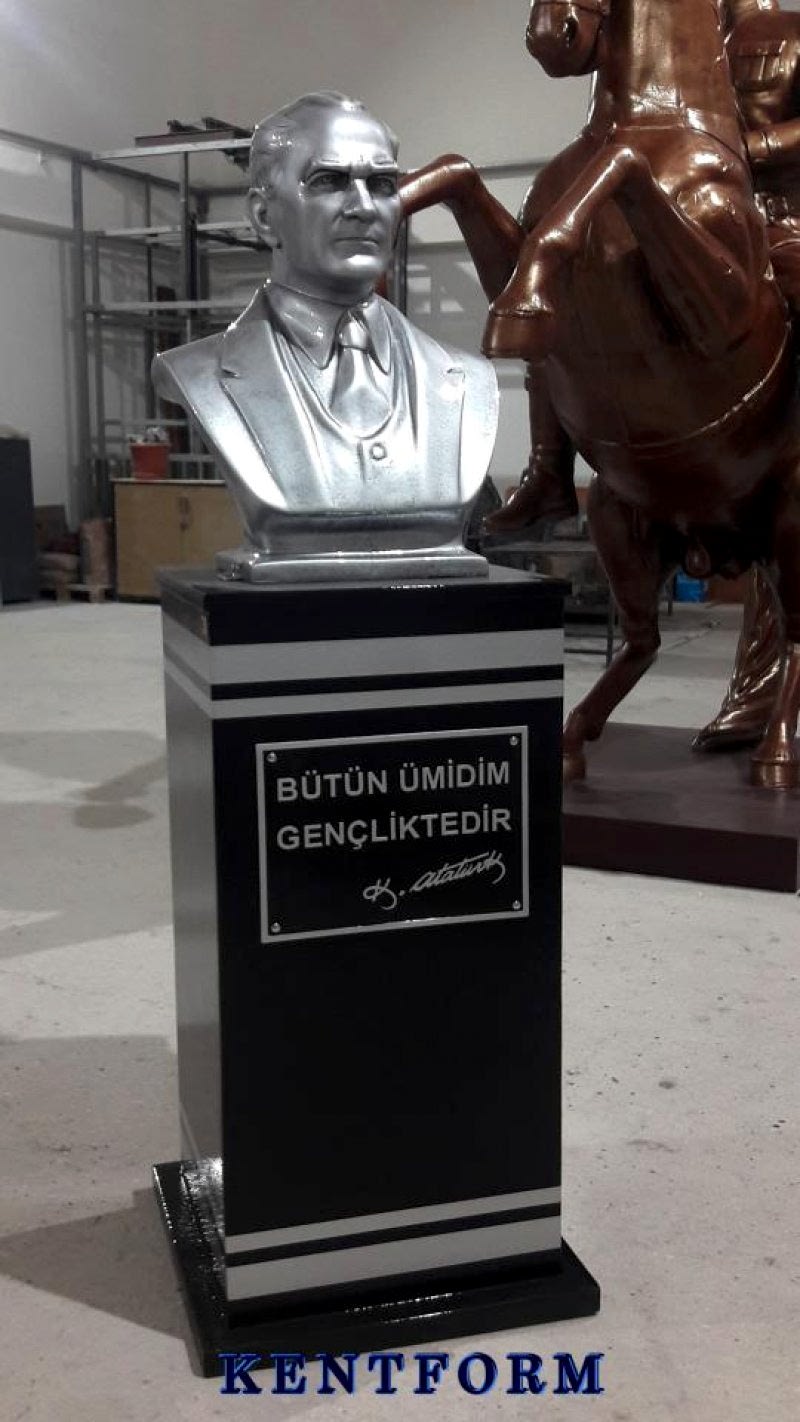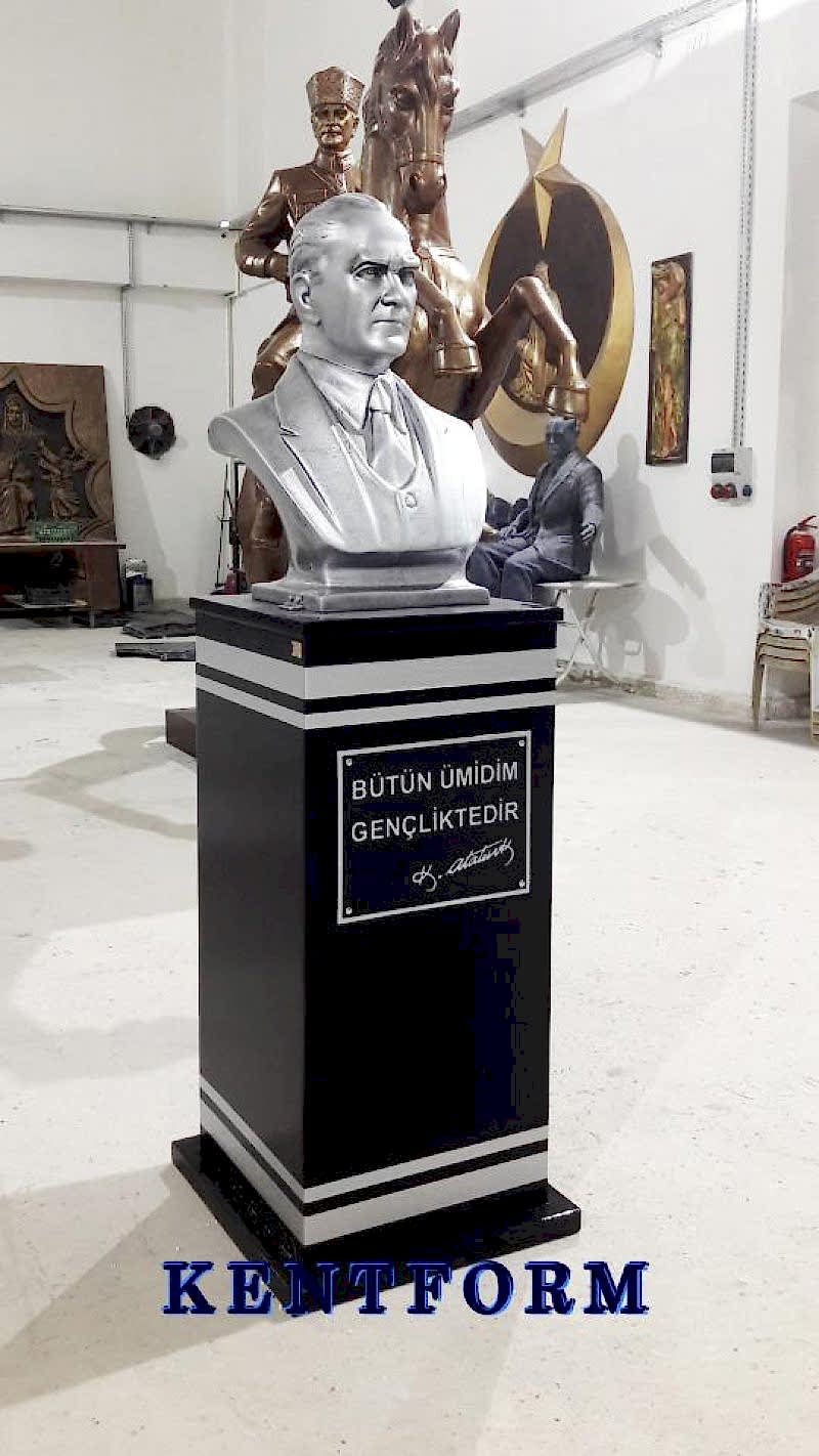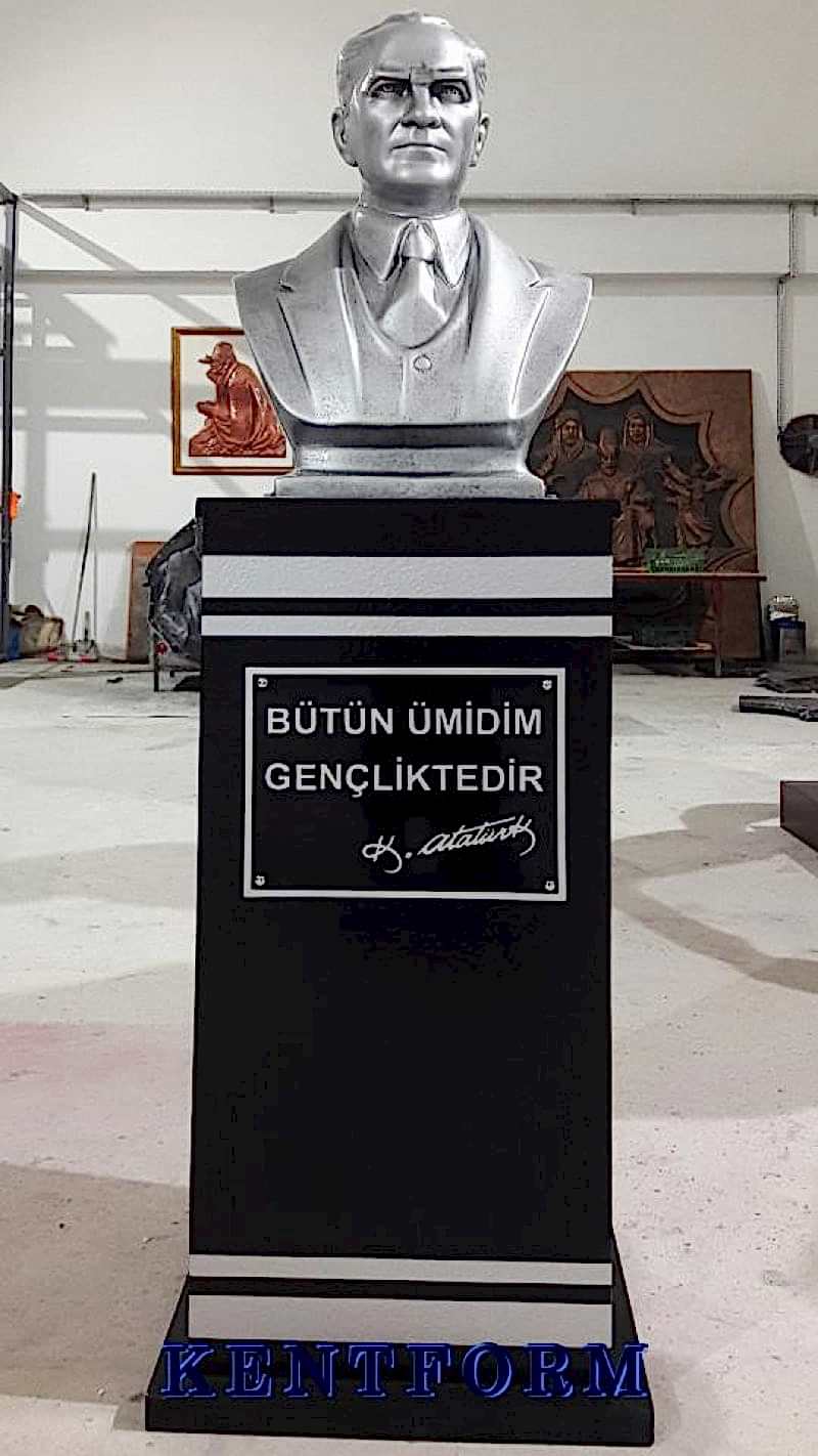Kaideli Atatürk Büstleri çalışmalarımızın tasarımı-modellemesi ve yapımı tamamiyle heykel firmamızın atölye çalışmalarına özgündür. Eserlerimizin tüm hakları ESER HAKLARI kapsamında korunmaktadır.Kaideli Atatürk Büstleri modellerimiz profosyonel çalışmalar olup gerek tasarım gerek anotomik yapısı özel profosyonel çalışmalardır.Hazır Kaide Üzerine Atatürk Büstü ve Kaide üzerine çerçeveli kabartma Yazı monte edilmiş yekpare (tek parça) şeklinde, bronz,gümüş renklerde kuşaklı,kuşaksız, farklı ölçü ve model çeşitlerinde Atatürk Büstleri ve Hazır Büst Kaideleri imalatları yapılmaktadatır. Büst Kaidelerinde ve Atatürk Büstlerinde ÖZEL DOKU uygulaması ile ağır tok görüntü sağlanmaktadır.Hazır Büst Kaideleri ve Atatürk Büstleri çalışmalarımız reçine polyester karışmlı fiberglas (CTP) malzemeden üretilmektedir.Atatürk Büstleri yapımı Hazır Büst Kaidesi yapımı,Atatürk büst heykelleri fiyatları ve Hazır Büst Kaidesi fiyatları, Atatürk Büstü modelleri ve Atatürk Büst çeşitleri hakkında heykel firmamızı arayarak bilgi alabilirsiniz.