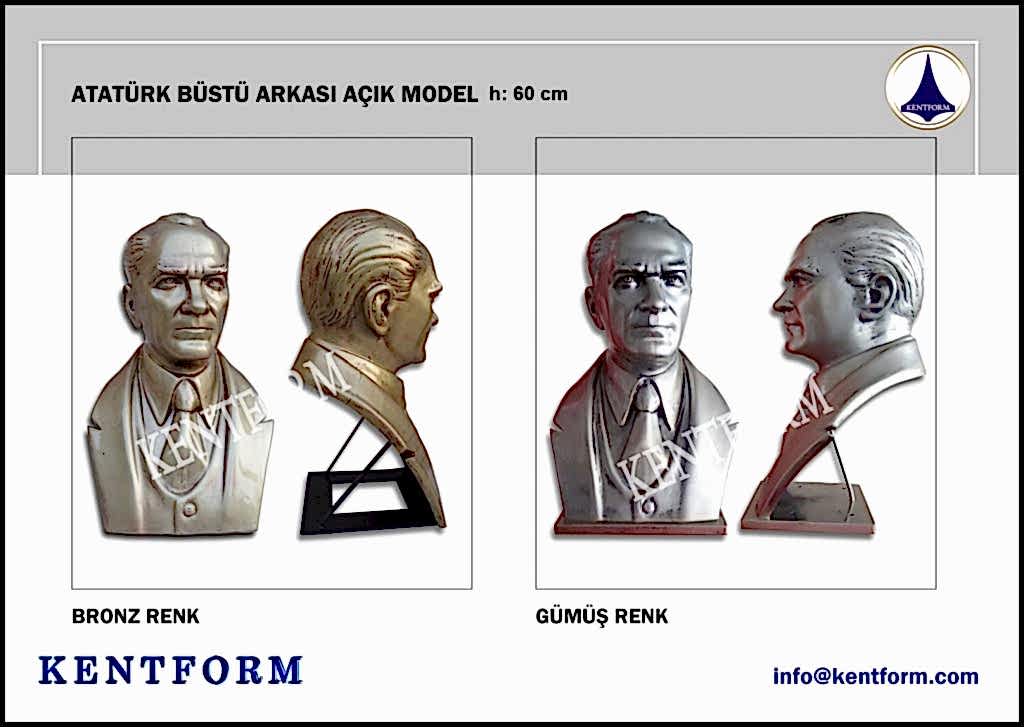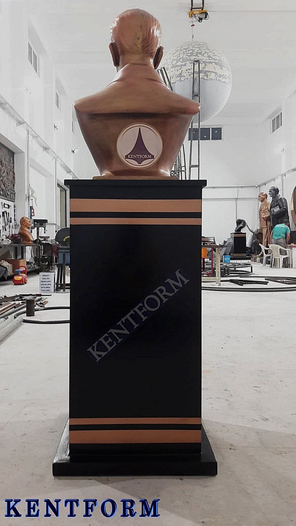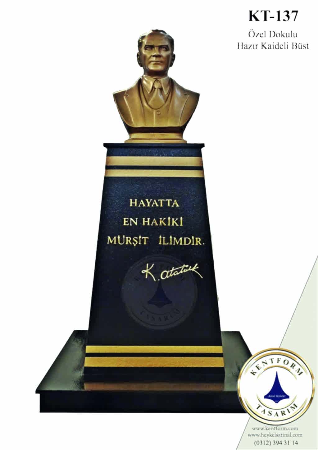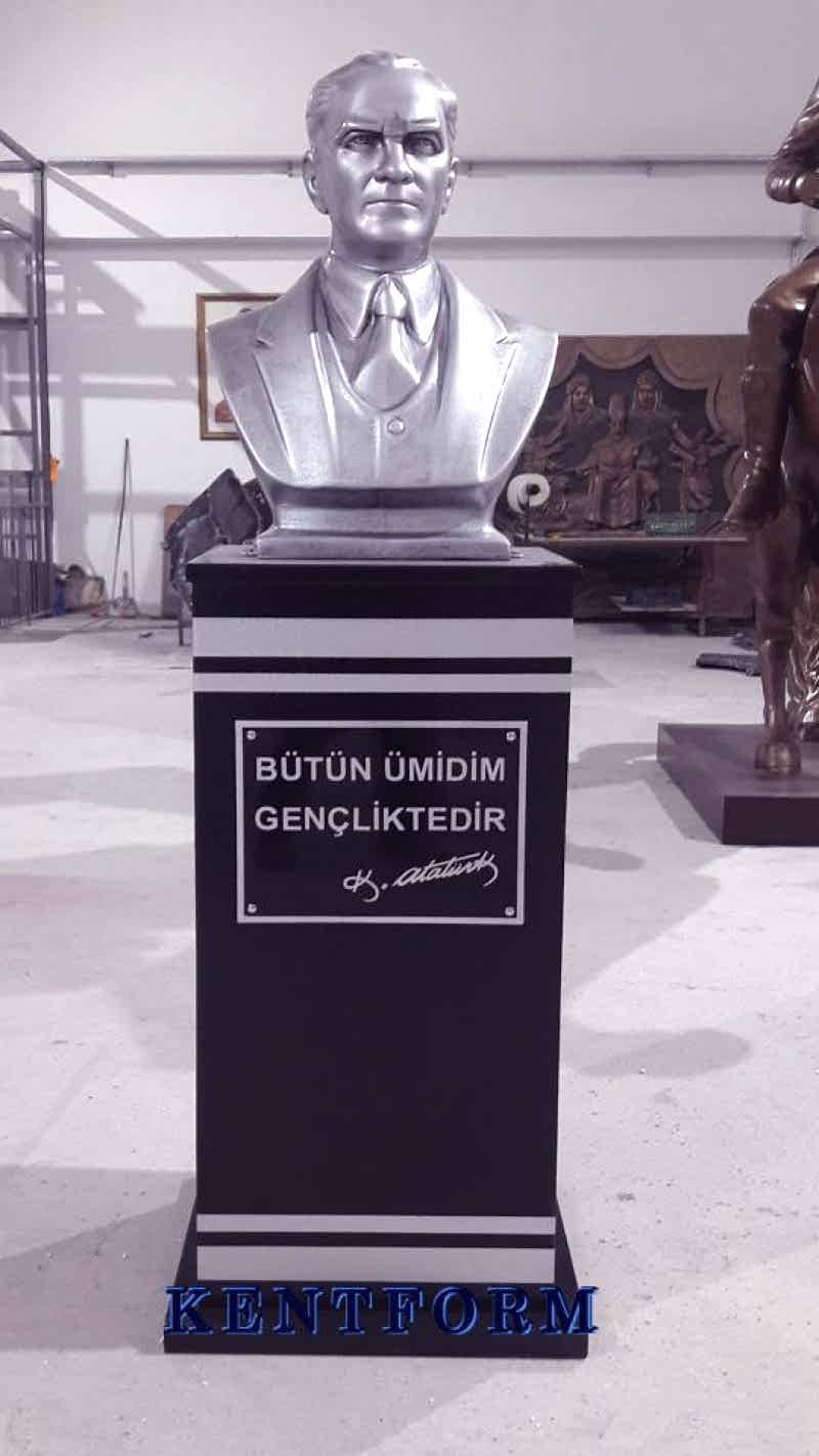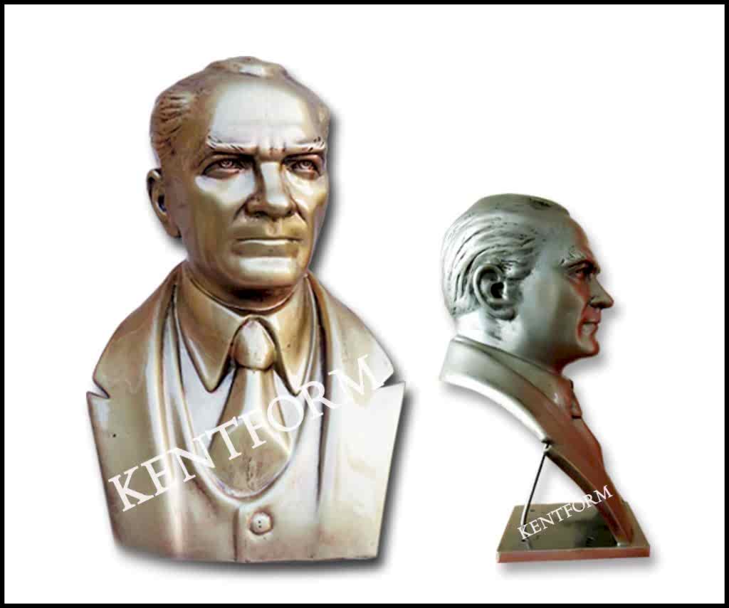 Kaideli Atatürk Büstleri çalışmalarımızın tasarımı-modellemesi ve yapımı tamamiyle heykel firmamızın atölye çalışmalarına özgündür. Eserlerimizin tüm hakları ESER HAKLARI kapsamında korunmaktadır.Kaideli Atatürk Büstleri modellerimiz profosyonel çalışmalar olup gerek tasarım gerek anotomik yapısı özel profosyonel çalışmalardır.Hazır Kaide Üzerine Atatürk Büstü ve Kaide üzerine çerçeveli kabartma Yazı monte edilmiş yekpare (tek parça) şeklinde, bronz,gümüş renklerde kuşaklı,kuşaksız, farklı ölçü ve model çeşitlerinde Atatürk Büstleri ve Hazır Büst Kaideleri imalatları yapılmaktadatır. Büst Kaidelerinde ve Atatürk Büstlerinde ÖZEL DOKU uygulaması ile ağır tok görüntü sağlanmaktadır.Hazır Büst Kaideleri ve Atatürk Büstleri çalışmalarımız reçine polyester karışmlı fiberglas (CTP) malzemeden üretilmektedir.Atatürk Büstleri yapımı Hazır Büst Kaidesi yapımı,Atatürk büst heykelleri fiyatları ve Hazır Büst Kaidesi fiyatları, Atatürk Büstü modelleri ve Atatürk Büst çeşitleri hakkında heykel firmamızı arayarak bilgi alabilirsiniz.