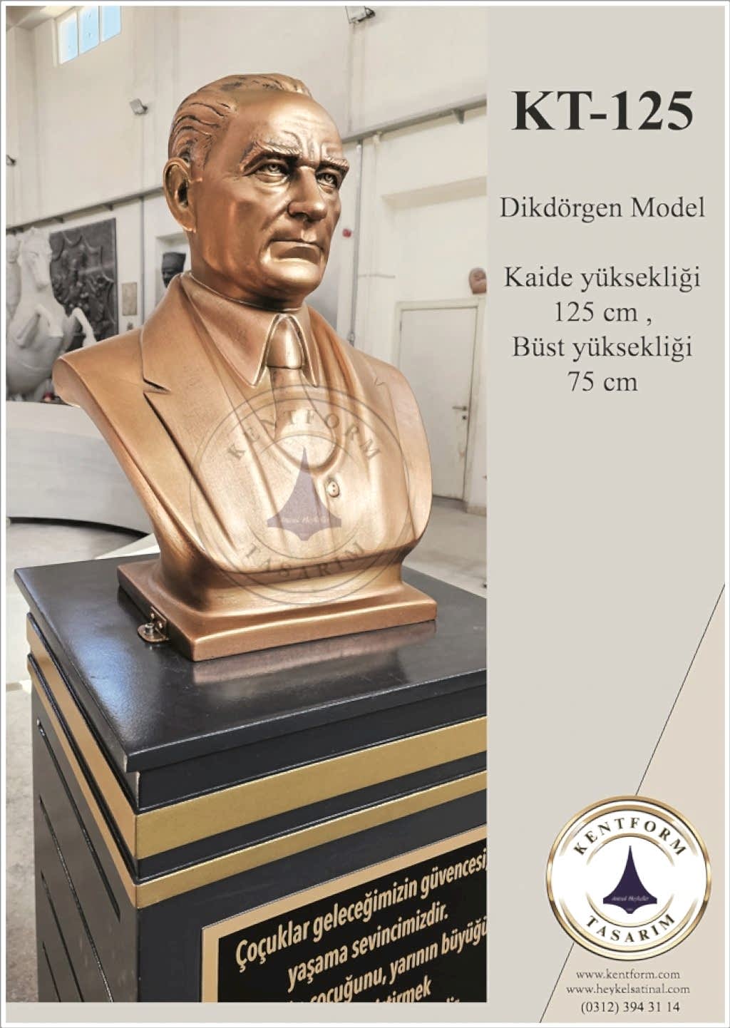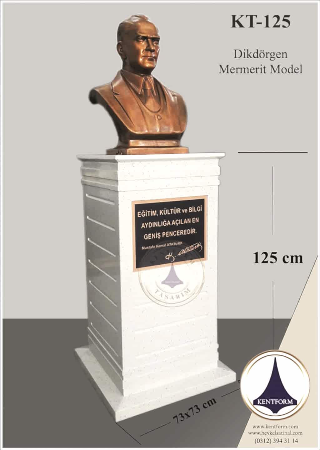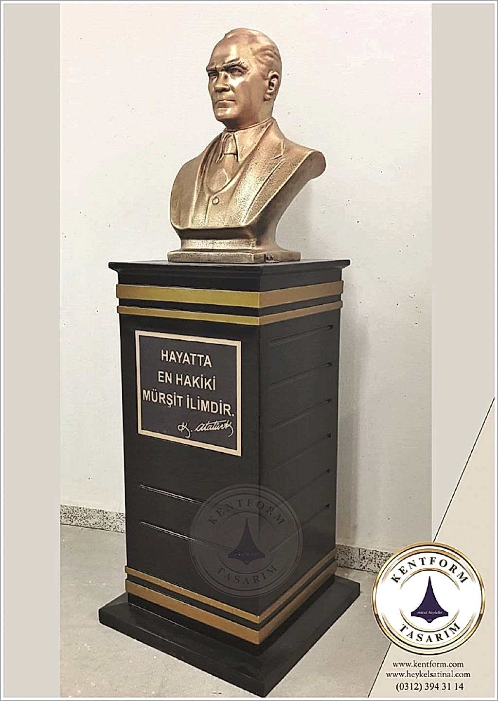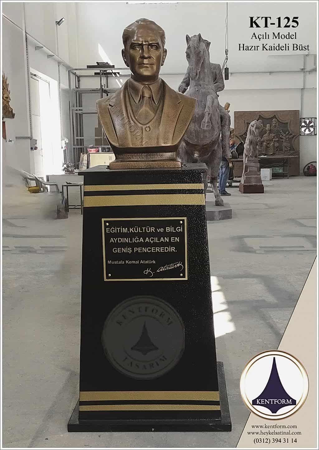 Kaideli Atatürk Büstleri çalışmalarımızın tasarımı-modellemesi ve yapımı tamamiyle heykel firmamızın atölye çalışmalarına özgündür. Eserlerimizin tüm hakları ESER HAKLARI kapsamında korunmaktadır.Kaideli Atatürk Büstleri modellerimiz profosyonel çalışmalar olup gerek tasarım gerek anotomik yapısı özel profosyonel çalışmalardır.Hazır Kaide Üzerine Atatürk Büstü ve Kaide üzerine çerçeveli kabartma Yazı monte edilmiş yekpare (tek parça) şeklinde, bronz,gümüş renklerde kuşaklı,kuşaksız, farklı ölçü ve model çeşitlerinde Atatürk Büstleri ve Hazır Büst Kaideleri imalatları yapılmaktadatır. Büst Kaidelerinde ve Atatürk Büstlerinde ÖZEL DOKU uygulaması ile ağır tok görüntü sağlanmaktadır.Hazır Büst Kaideleri ve Atatürk Büstleri çalışmalarımız reçine polyester karışmlı fiberglas (CTP) malzemeden üretilmektedir.Atatürk Büstleri yapımı Hazır Büst Kaidesi yapımı,Atatürk büst heykelleri fiyatları ve Hazır Büst Kaidesi fiyatları, Atatürk Büstü modelleri ve Atatürk Büst çeşitleri hakkında heykel firmamızı arayarak bilgi alabilirsiniz.