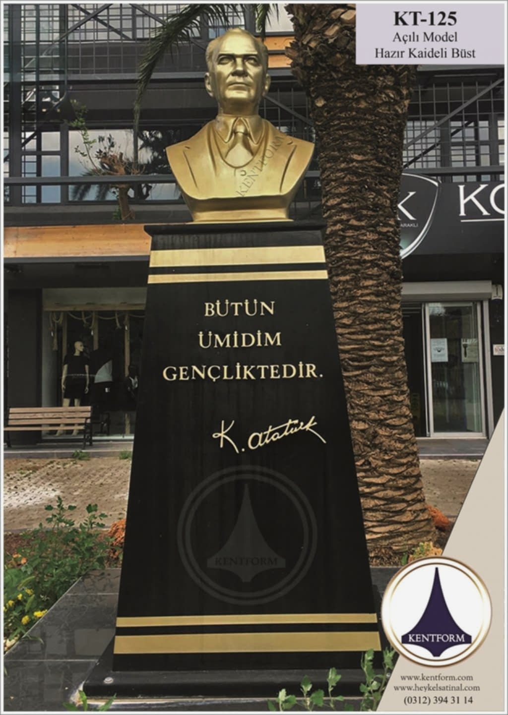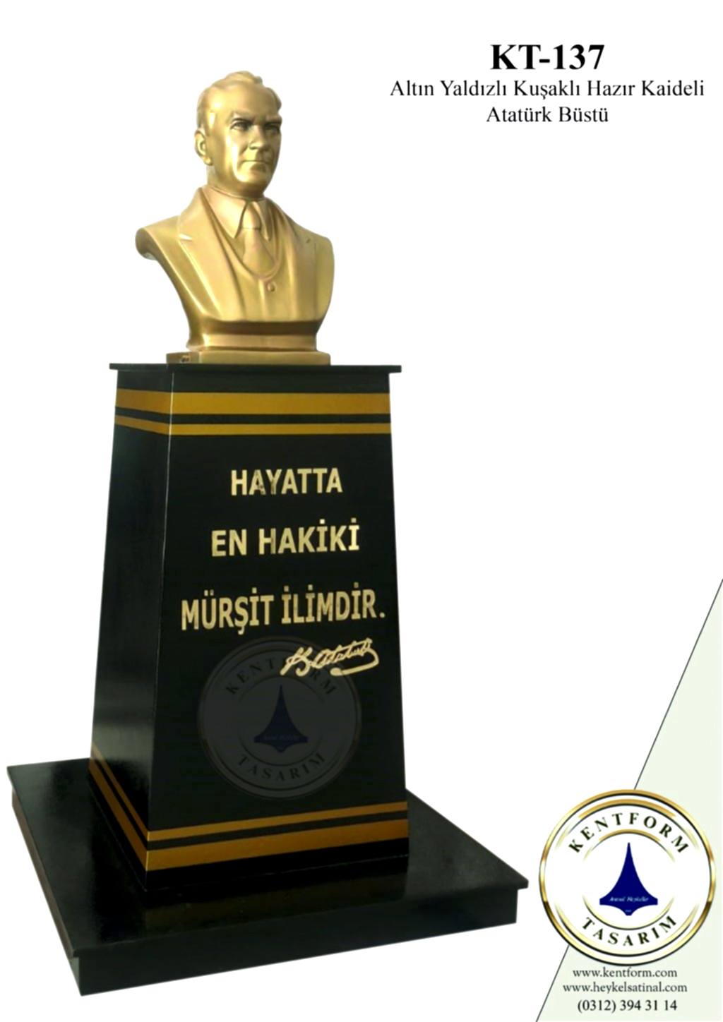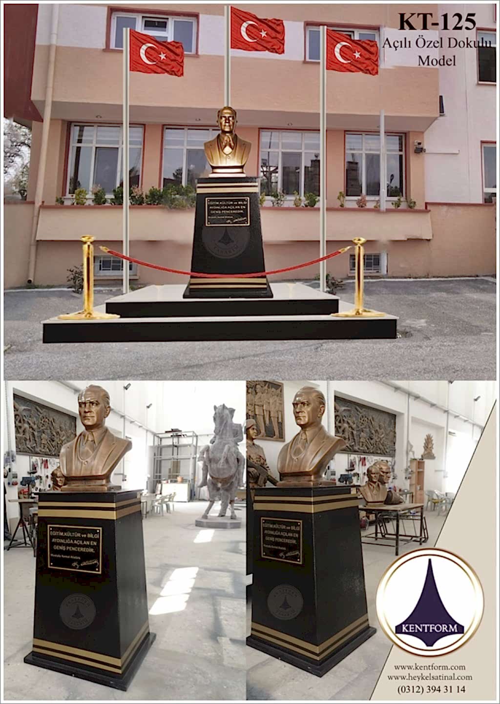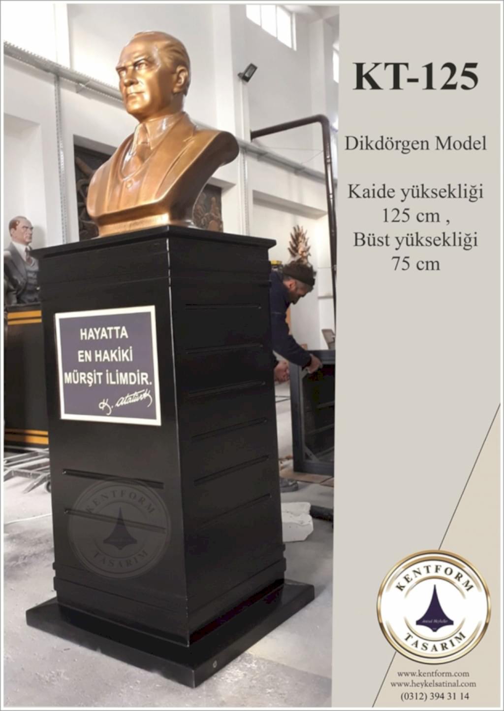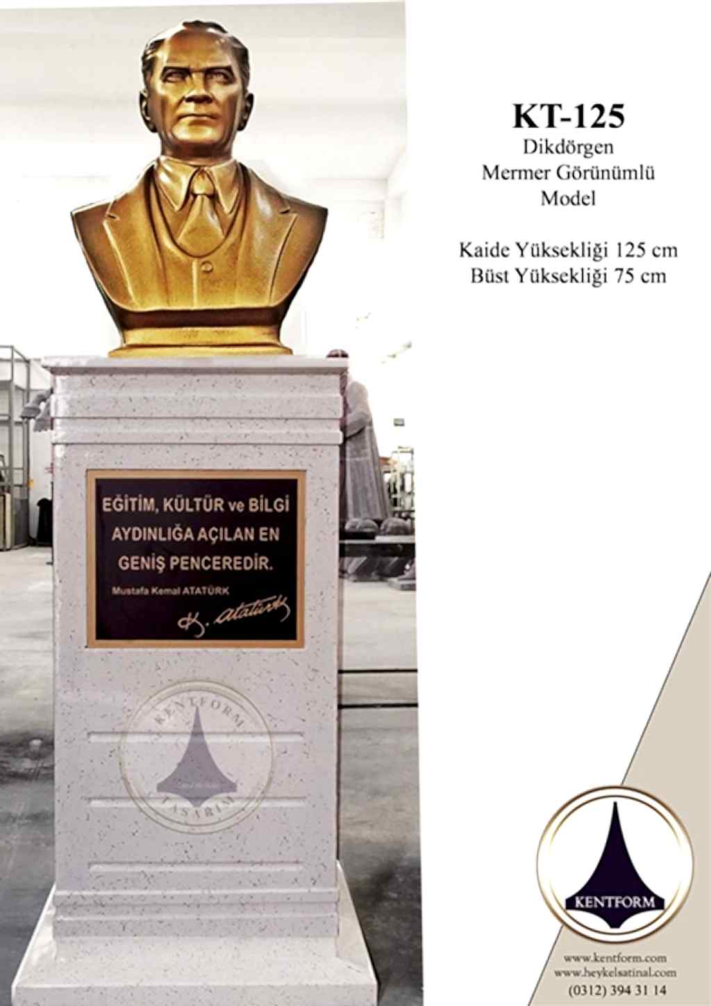 Kaideli Atatürk Büstleri çalışmalarımızın tasarımı-modellemesi ve yapımı tamamiyle heykel firmamızın atölye çalışmalarına özgündür. Eserlerimizin tüm hakları ESER HAKLARI kapsamında korunmaktadır.Kaideli Atatürk Büstleri modellerimiz profosyonel çalışmalar olup gerek tasarım gerek anotomik yapısı özel profosyonel çalışmalardır.Hazır Kaide Üzerine Atatürk Büstü ve Kaide üzerine çerçeveli kabartma Yazı monte edilmiş yekpare (tek parça) şeklinde, bronz,gümüş renklerde kuşaklı,kuşaksız, farklı ölçü ve model çeşitlerinde Atatürk Büstleri ve Hazır Büst Kaideleri imalatları yapılmaktadatır. Büst Kaidelerinde ve Atatürk Büstlerinde ÖZEL DOKU uygulaması ile ağır tok görüntü sağlanmaktadır.Hazır Büst Kaideleri ve Atatürk Büstleri çalışmalarımız reçine polyester karışmlı fiberglas (CTP) malzemeden üretilmektedir.Atatürk Büstleri yapımı Hazır Büst Kaidesi yapımı,Atatürk büst heykelleri fiyatları ve Hazır Büst Kaidesi fiyatları, Atatürk Büstü modelleri ve Atatürk Büst çeşitleri hakkında heykel firmamızı arayarak bilgi alabilirsiniz.