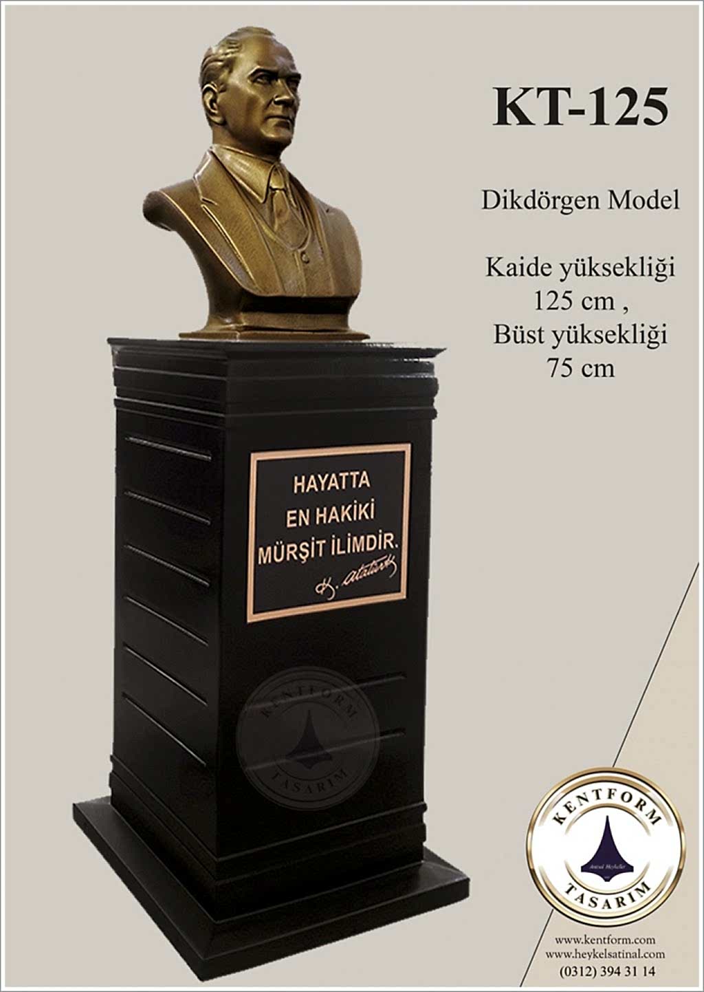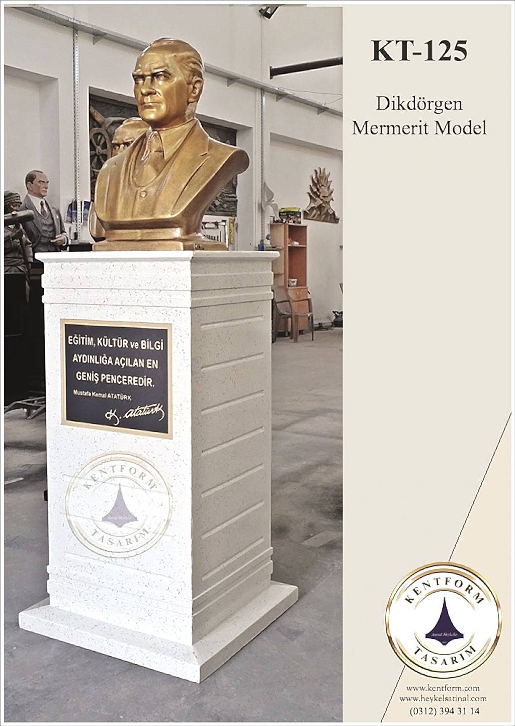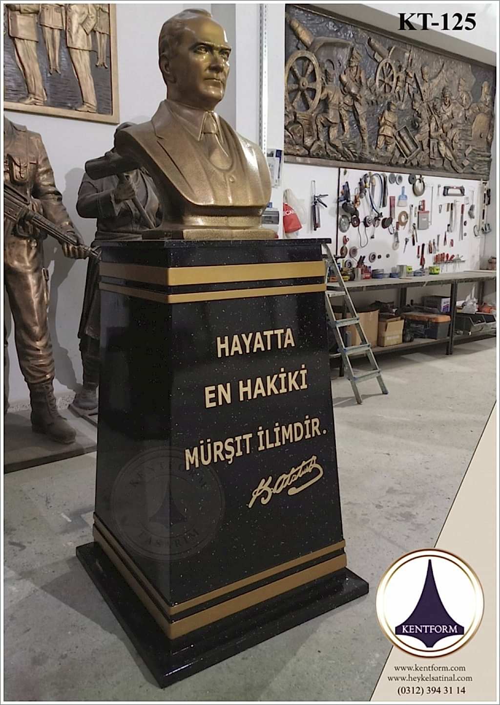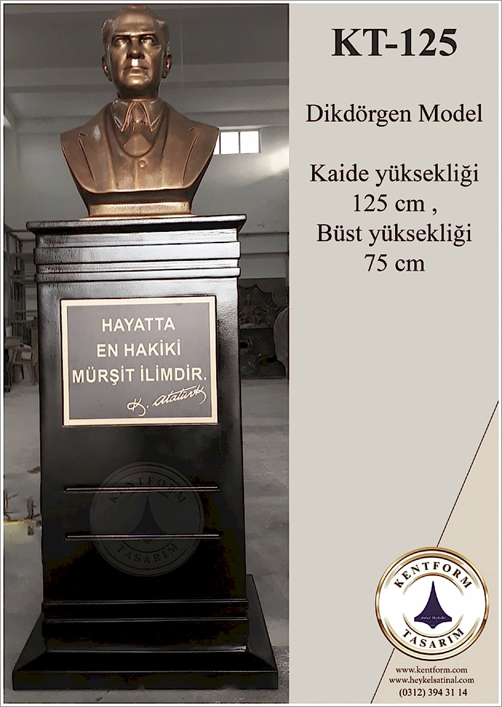 Kaideli Atatürk Büstleri çalışmalarımızın tasarımı-modellemesi ve yapımı tamamiyle heykel firmamızın atölye çalışmalarına özgündür. Eserlerimizin tüm hakları ESER HAKLARI kapsamında korunmaktadır.Kaideli Atatürk Büstleri modellerimiz profosyonel çalışmalar olup gerek tasarım gerek anotomik yapısı özel profosyonel çalışmalardır.Hazır Kaide Üzerine Atatürk Büstü ve Kaide üzerine çerçeveli kabartma Yazı monte edilmiş yekpare (tek parça) şeklinde, bronz,gümüş renklerde kuşaklı,kuşaksız, farklı ölçü ve model çeşitlerinde Atatürk Büstleri ve Hazır Büst Kaideleri imalatları yapılmaktadatır. Büst Kaidelerinde ve Atatürk Büstlerinde ÖZEL DOKU uygulaması ile ağır tok görüntü sağlanmaktadır.Hazır Büst Kaideleri ve Atatürk Büstleri çalışmalarımız reçine polyester karışmlı fiberglas (CTP) malzemeden üretilmektedir.Atatürk Büstleri yapımı Hazır Büst Kaidesi yapımı,Atatürk büst heykelleri fiyatları ve Hazır Büst Kaidesi fiyatları, Atatürk Büstü modelleri ve Atatürk Büst çeşitleri hakkında heykel firmamızı arayarak bilgi alabilirsiniz.